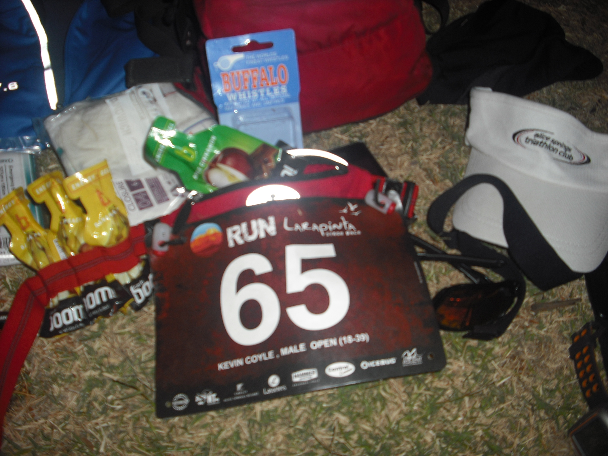 Once there, we pitched the tent, ate some cheap & processed $1 noodle packages, whole wheat bread rolls, some coke, and chia pudding pods. I got all my gear organized which consisted of: shoes, socks, shorts, Anytime Fitness singlet, thermal, beanie, Garmin 310XT GPS, HR Monitor, 2 Red Bulls, 10 Gels/Shot Bloks, 10 Salt Tablets, 3 Liters of Water, 2 racing bibs, a whistle, a first aid kit, a Space blanket, a map, lighter, phone, camera, glasses, and Alice Springs Triathlon Club Visor. In bed at 9PM, right after I saw a dingo walking past our tent.
