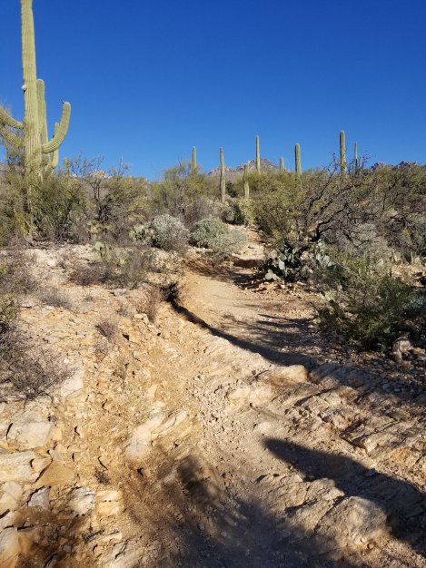 We started ascending up the trails into Sabino Canyon. The beauty was stunning. Cactus, rock formations, and vistas at every bend. Soon, Daniel heard my labored breathing and he let me lead while I got out a few words at a time and he ran effortlessly. Eventually, my legs felt quite heavy climbing the 1,200’ and I bit it. And by that I mean the rocks ate some skin from my hands and arms.
