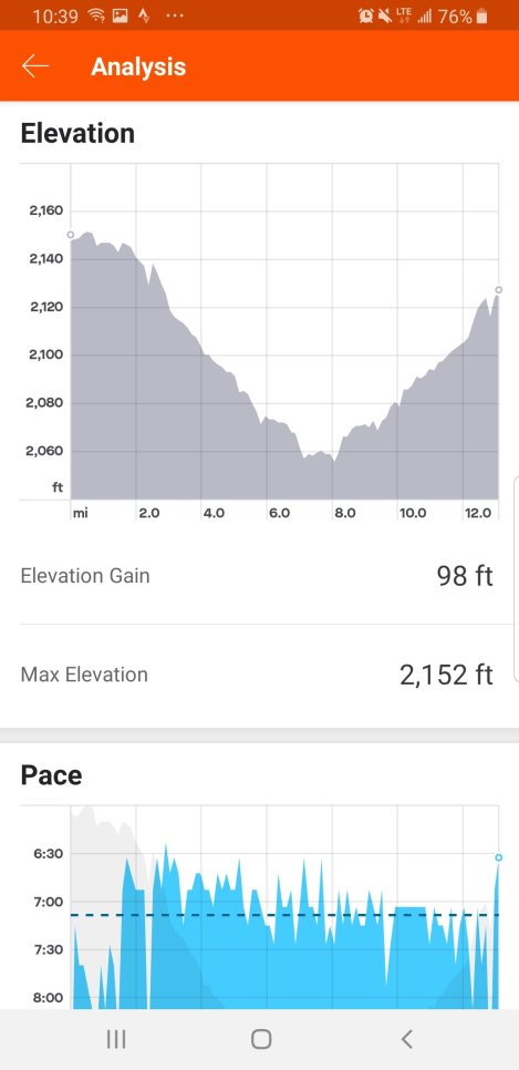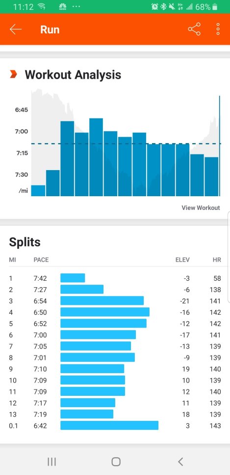 Next mile 7:27. By this point I had run down 8 people but my brand new Altra Escalante Paris Racers laces loosened so I stopped to tie but was passed by those stretched out 8 again. By mile 3 in 6:54 I ovetook them and was sitting in 5th. Mile 4 in 6:50 on the edge of Threshold Zone with 142 HR and 4th place was 30s up the Loop Path. I just tried to maintain this effort, breathing hard, legs warming up and slowly reeled him in. He made 3 surges when I came within 2 seconds and I thought, “keep it up buddy, trash those kegs, i will find my moment and make my move and break you”. It came at the turn around at 7.5 miles. I heard his breath pickup and it go quiet. I was gone. My legs were aching a bit by mile 10 and I was thinking to maintain into the light head wind, using HR to measure intensity which was holding on 141. I grabbed gatorade at each aid station and now had hundreds around me from the 5K, Quarter Marathon including great decorated people and many Team Hoyt members which reminded me of competing alongside many races with Rick and Dick Hoyt in Boston and the metro area 10 years ago.