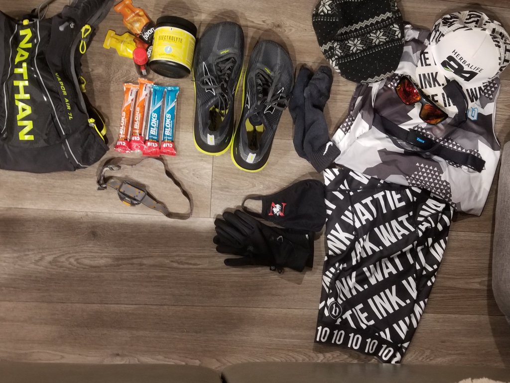 I will be wearing my Kona Wattie Ink kit, Nathan Vapor pack with 2 Liters of Electrolytes, carrying 4 cliff blocks, 2 BOOM gels, and a HotShot. I will have my newer Altra Duo 1.5 shoes, UA socks, Wattie Cap, gloves and will be listening to music via amazon and sirius radio.