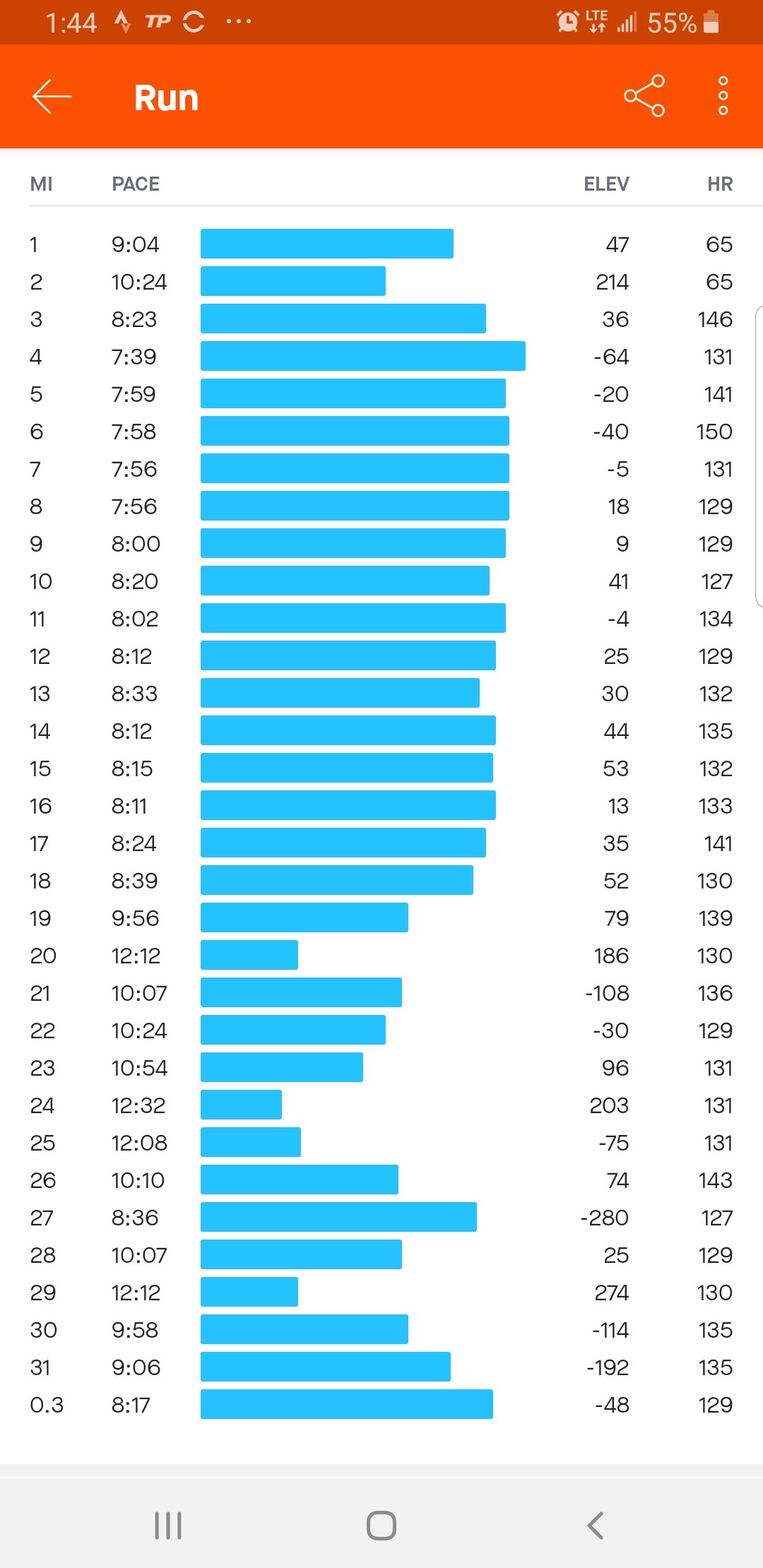 At the first aid at mile 9, the guy was asking for salt tablets. I grabbed a banana and took off; I never saw him again. I had Lisa in sight fir the next mile or two but my pace slowed from 8minute miles which I considered, solid and consisitent, not overly taxing, to 8:20 into a head wind. Although mile 2 was a 10:24 climbing 214′, I was really consistent through 18 miles running between 7:39 and 8:39. I didn’t stop except at the aid station 9 and 16miles where Lisa was 90sec ahead of me. But as soon as I left the 16mile aid, there were 2 runners right there. I was dissapointed since I hadnt seen anybody behind me since mile 10 but I held off one of them until mile 20’s steep 186 climb and then mile 21 but that was it. I would remain in 5th. With temps only reaching mid 60s, I was happy that it was delayed 2 months; I would never have done this well in 90F temps. My hamstring tightened up by mile 18 and my quads started aching by mile 19/20. But I wanted this, I wanted to go Sub5.
