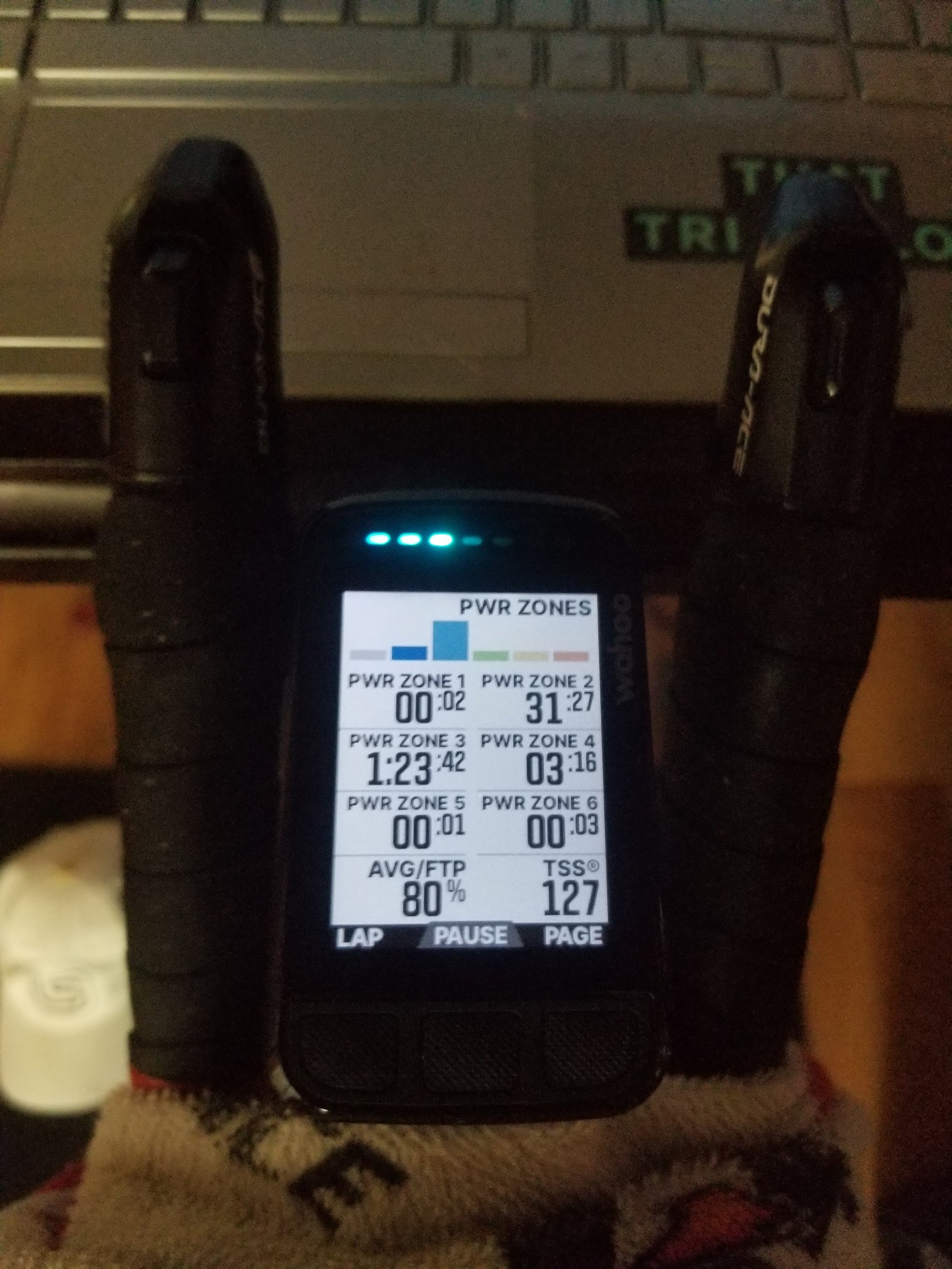 A 12min transition to the treadmill and I did a progression run to faster than race pace starting at 7:59/mile and finishing at 7:26/mile. I averaged 7:41/mile which was faster than the 7:46/mile from 4 weeks earlier. After another 12min transition I was back on the bike. I had the a/c on to 70F vs 60F i usually have it on and believe in running in colder temps to bud the run fitness while getting geat acclitizdd closer to race day.. it will be 70F to 100F,… luck of the draw.