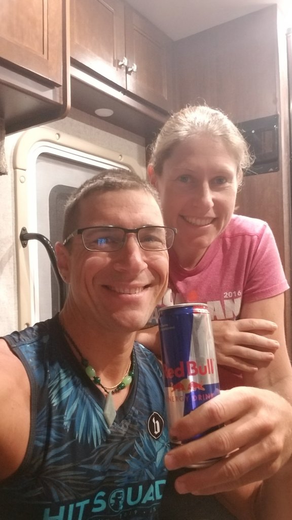 Once again, we carbolooaded for 2 days using the research and guidance of Sean Foster of the Melbourne Tri Club in Australia and The Australian Institute of Sport. I drank many liters of sprite, lots of rice crispy treats, and candy. We had lots of bread in the days before the race. We used the $25 food voucher to get two pizzas from Vicino Pizza around 3 o’clock the day before, and for dinner was a new experiment inspired by Lionel Sanders: 2 cups of Ramen noodles which gave me 100% daily value of salt: more than 2 Grams. And tradition called for Sparkling wine. Target was around 4,000 calories per day. Plug to the 99% Podcast, look it up, great job by Arizona based Pro Triathletes.