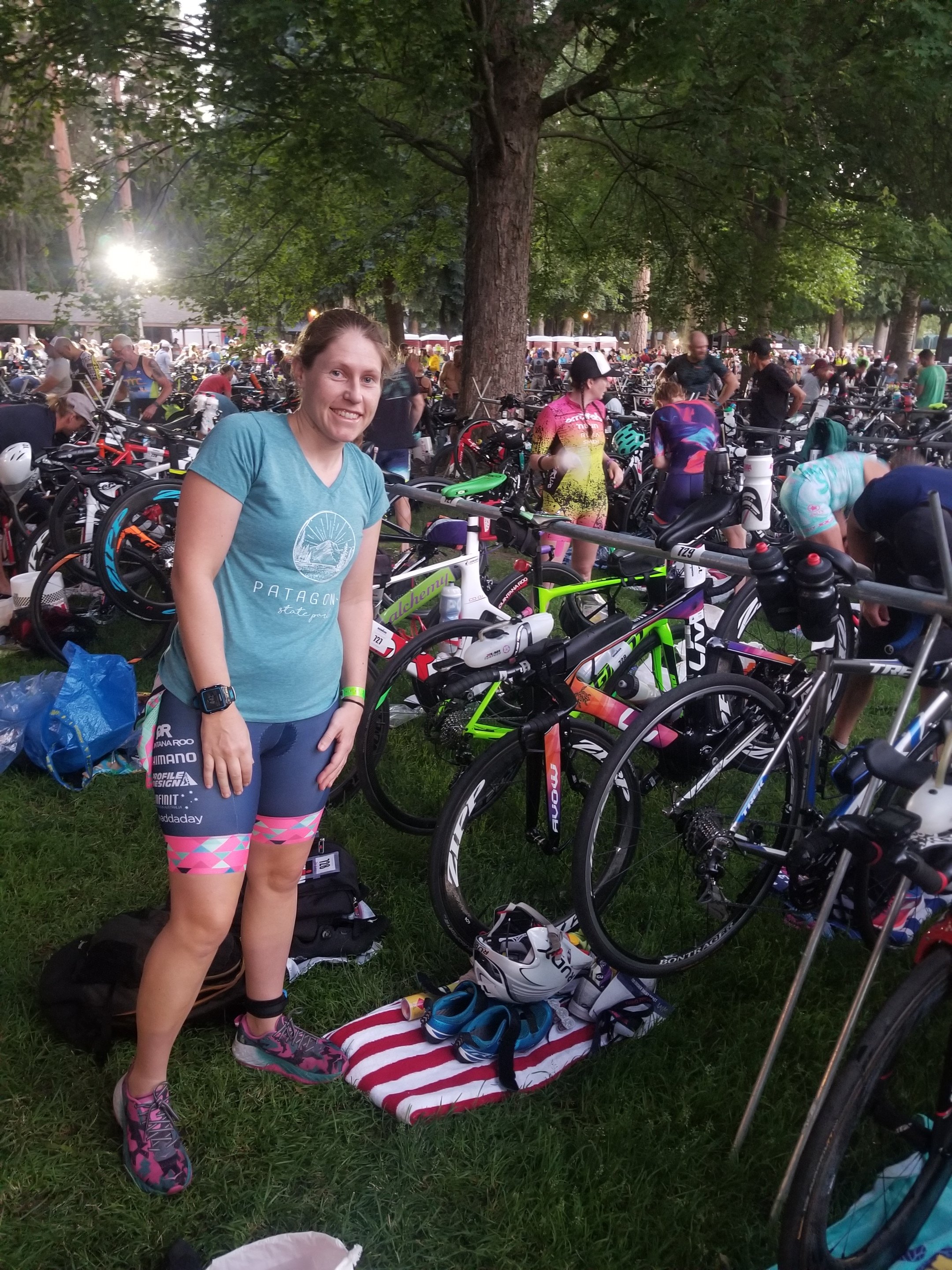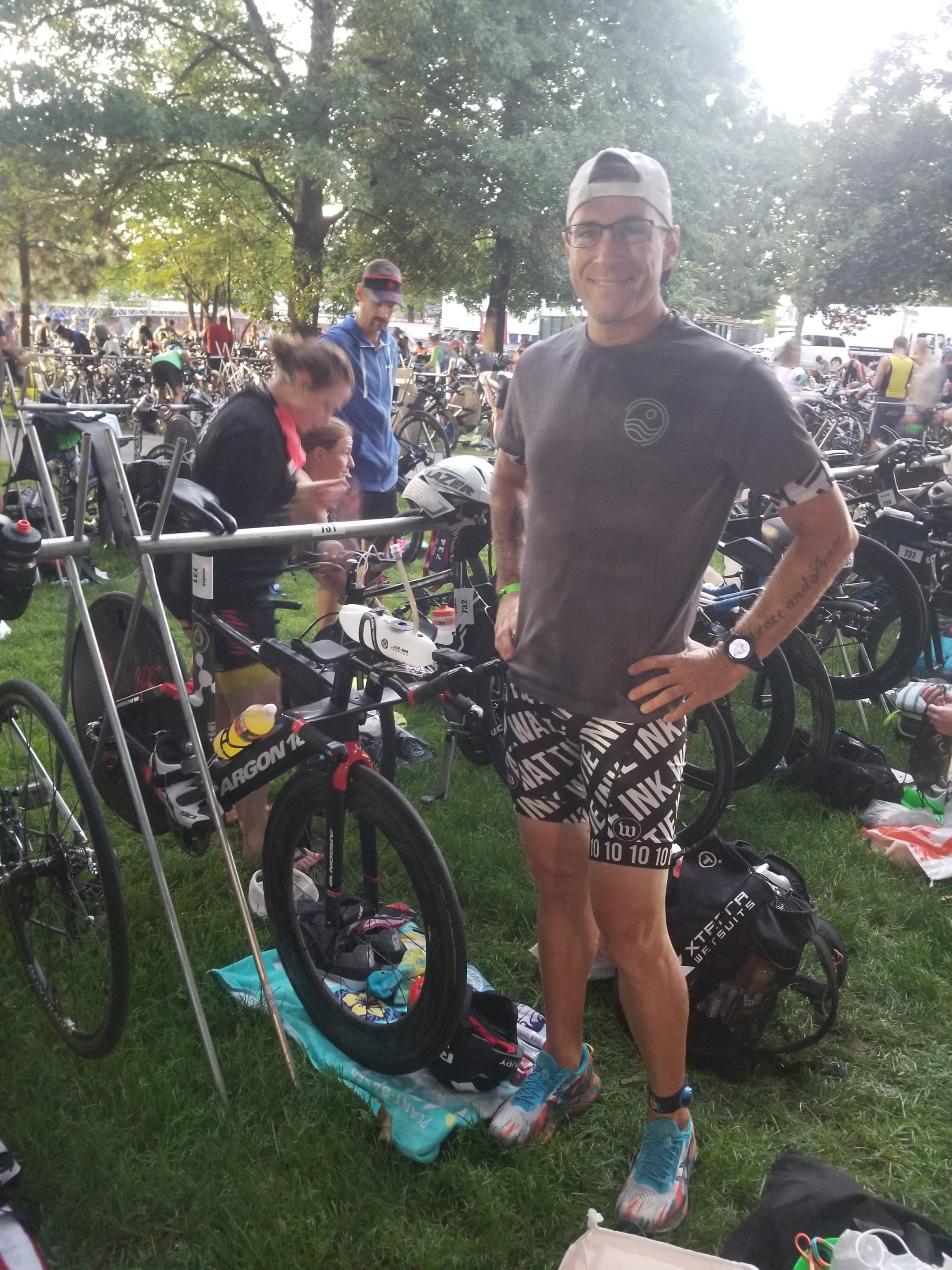 3:00 a.m. wake up for a 5:30 a.m. start I had 4 pieces of toast with butter and jam, a medium red bull, and banana ~800 calories. We drove 5 minutes from the Blackwell RV resort and parked one minute away from transition at the ballpark. We went to our bikes and it was there that I saw my friend Elliot Kawaoka who is in my M35-39 A/G. Tires pumped up to a 110 PSI, 1 bottle of water in the torpedo cage one bottle of Gatorade on the down tube, 4 packs of clif shot bloks in the bento Box. 3 Tubes and CO2s all ready in the large Argon18 E119 Tri+ lunchbox. Wahoo Bolt on and my transition was laid out on my Kona towel with my brand new Rudy project aero helmet and visor, and my regular glasses. I decided to use these because my brand new Rudy project polarized sunglasses were not working well with the polarized Visor. I had my bike cleats attached in the pedals with rubber bands holding them parallel to the ground I had an Immodium open and ready to go on my run shoes, one in the bento box, on top of the 2 I had with breakfast. I also had my Hansons Brooks running singlet with bib attached. I no longer use a race belt nor tri top nor one piece since I always hit the loo. I don’t carry any nutrition either; I only rely on Coke and red bull at the aid stations. I also had my TTL hat on that I was going to use instead of a visor to help protect my head and hold ice during the run. We hit the loo, went over to the swim area. I gave one last kiss to Fiona and wished her best of luck. I lined up in the sub 1 hour area and headed to the water for a warm up in which I took some strokes and bobbed around a little bit in the perfect temperature cool water of around 68゚F. I seated myself into the leftmost lane heading into the water. I saw Mike Riley. I watched the pros come out of the water and enter the 2nd lap of 1.2 miles. And I also saw one up my Instagram friends who I had first met in Kona 2016 who has done 177 Ironmans, is an absolute legend, and is a dealer of Scotch who has also climbed mount Everest, Luis Alvarez. (he makes it into like every Ironman Raceday video on YouTube).