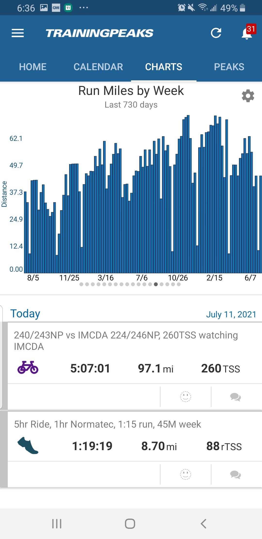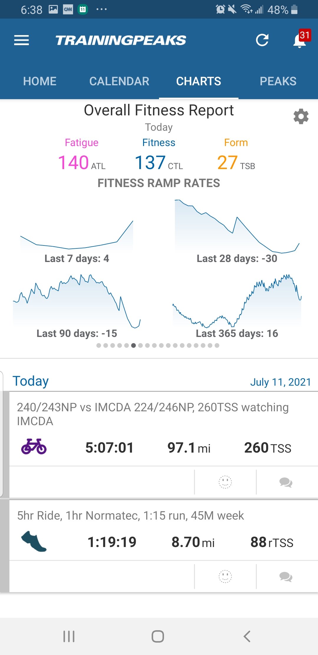 It’s only been 2 weeks since I qualified for Kona after going 10:18 and took 18/189 M35-39 at Ironman Couer d’Alene but I am already back with quality work having recovered faster than any of my other 15Ironmans in the past. I attribute that recovery to training at quite a high level but also having less power on the bike and speed on the run than planned. Through today, July 11, 2021, I have trained 516hours which is 18.9hours per week on average. In the race as outlined in my report, I was in 260-270watt shape but only held 246NP. On the run, I only went 8:57/mile while being in 7:45/mile shape.