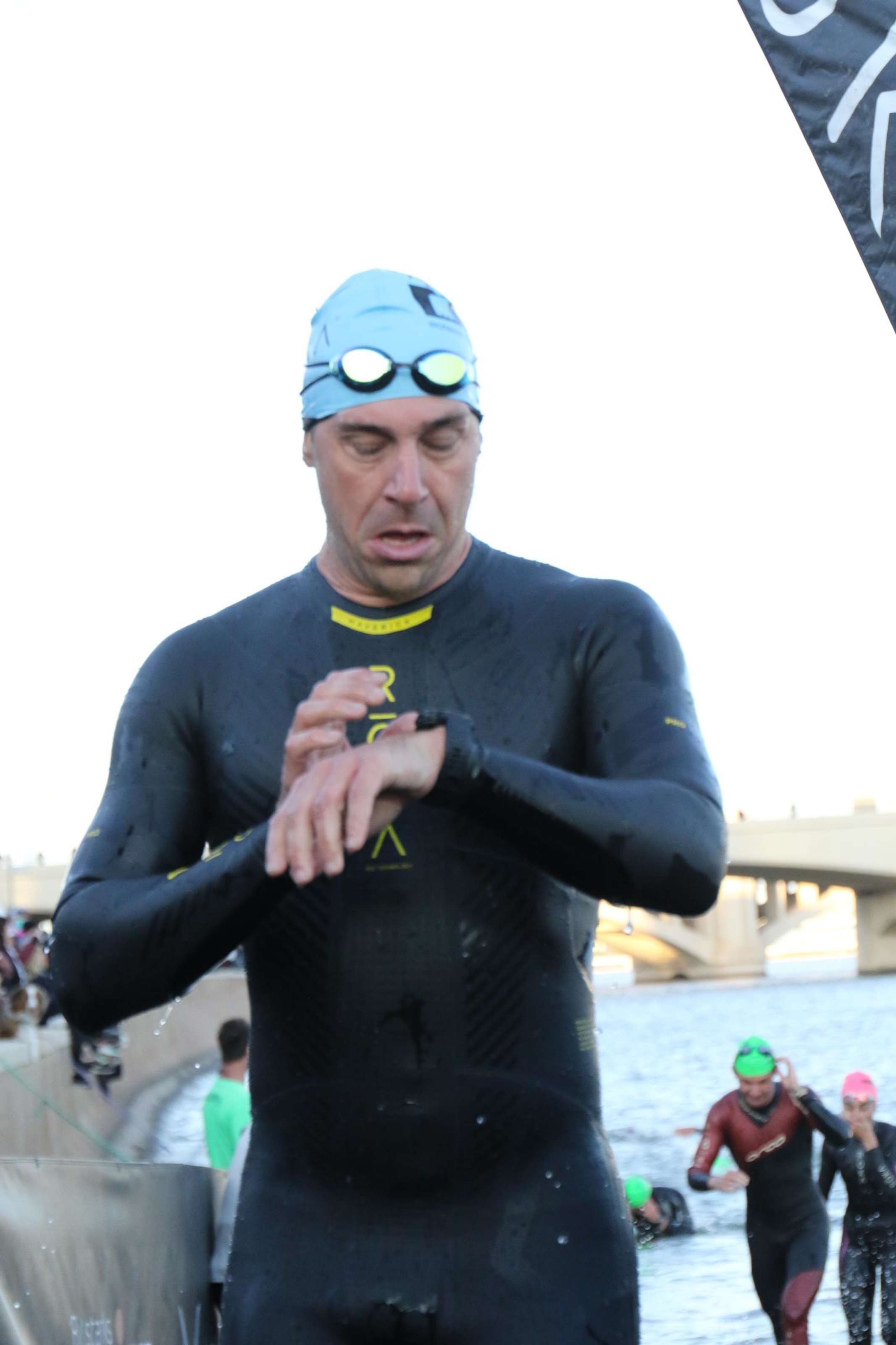 We dropped off our bags and put our wetsuits on, then walked down to the swim start. Fiona lined up in the 1:05 area and I lined up in the sub 1hour area. I saw 6’4 Pete towering over all and waved to him from a far. I saw the pro’s practice swimming in the cold 60F water and listened to the National Anthem. First the Pro Men, Pro Women, and then it was me with 6 other athletes going off every 10 seconds.