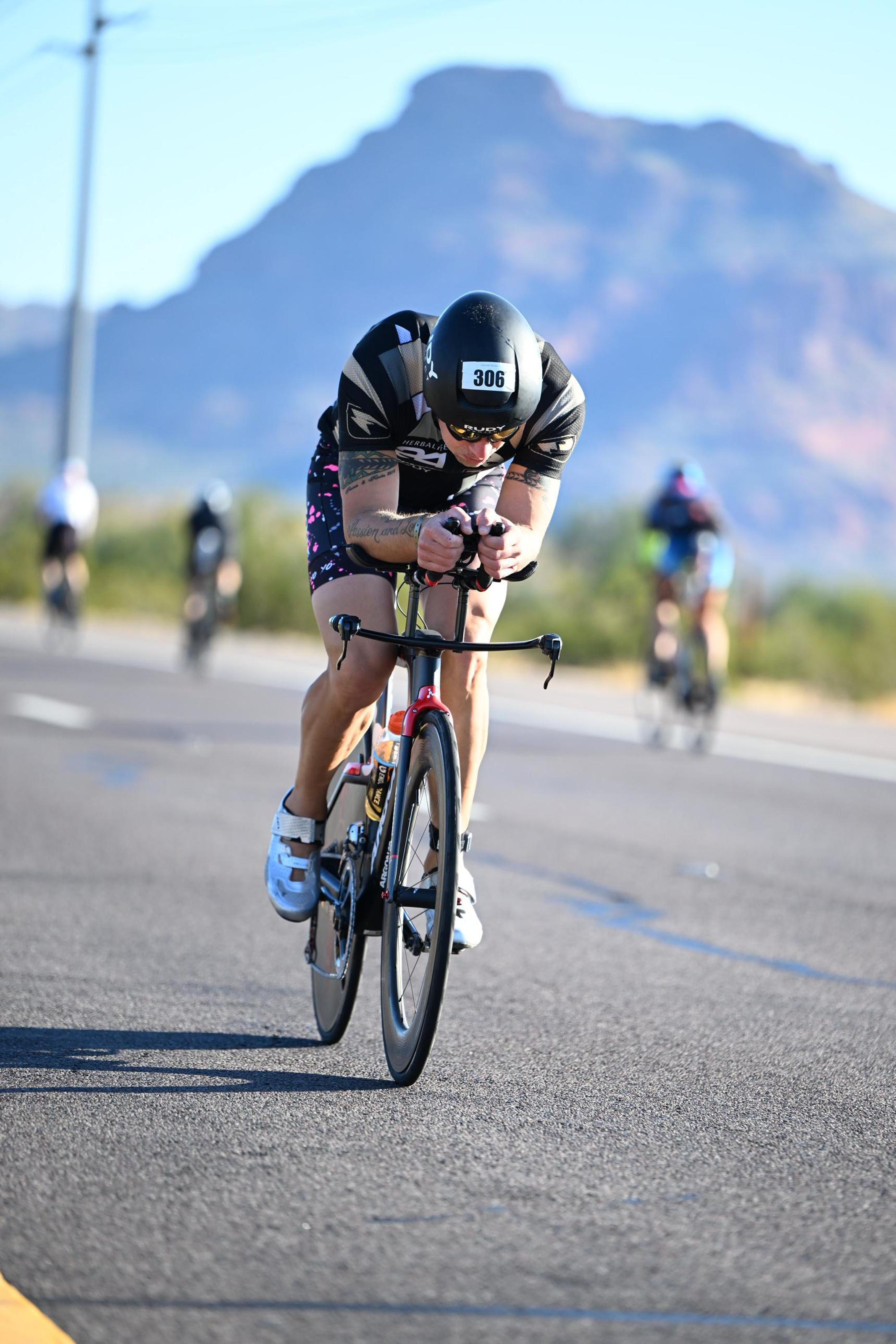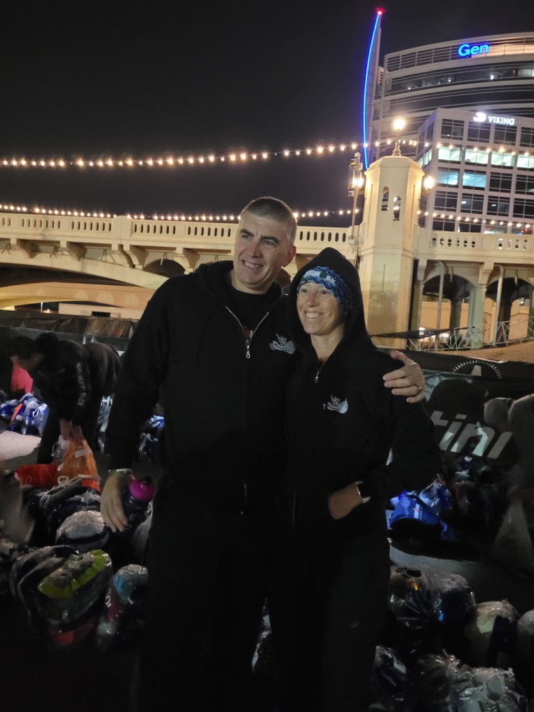 We woke up at 3:50AM, 3 hours before the start. I had 2 Imodium, 2 pieces of toast with butter and jam, 4 single servings of applesauce, and 2 Red Bulls for around 800 calories. We hung out, got our stuff in order and left around 4:45AM for the car-park. Of course, a line to get in but once in we headed to transition and as soon as we came to where the finish line was, the wind hit my face and I said, “It’s going to be a windy one today.” Off to the bike. Pump up tires to 100PSI, 1 Bottle Gatorade, 2 Bottles of LMNT salt with 1G of salt per bottle. 3 Packs of Clif Shot Bloks worth 600 calories and half with caffeine. Wahoo Bolt on. The bike looked great and was ready. Tom at tomsbicyclerepair.com in Tucson had cleaned up the bike, went over the whole thing, and put a brand-new UFO Ceramic Speed Chain on with white powder dust.