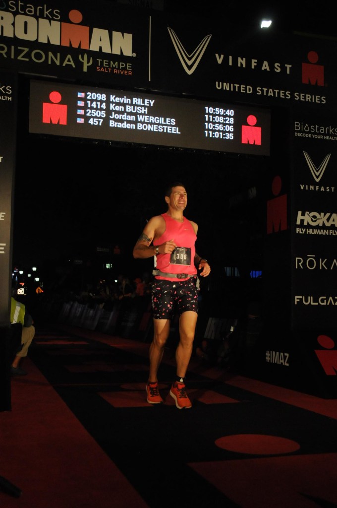 In short, off on the swim from a headwind, current, and heavy water, brutal winds on the bike with a throbbing left leg, off the bike and the body struggling to move. After a pit stop at mile 4, I started to have strong pain in my sternum in which I would only be able to run for 2-5 light poles before I had to walk. My slowest marathon and my slowest Ironman ever but happy to be called an IRONMAN for the last time by Mike Rielly who is retiring after 33 years of announcing half a million finishers since the 1989 Iron-War.