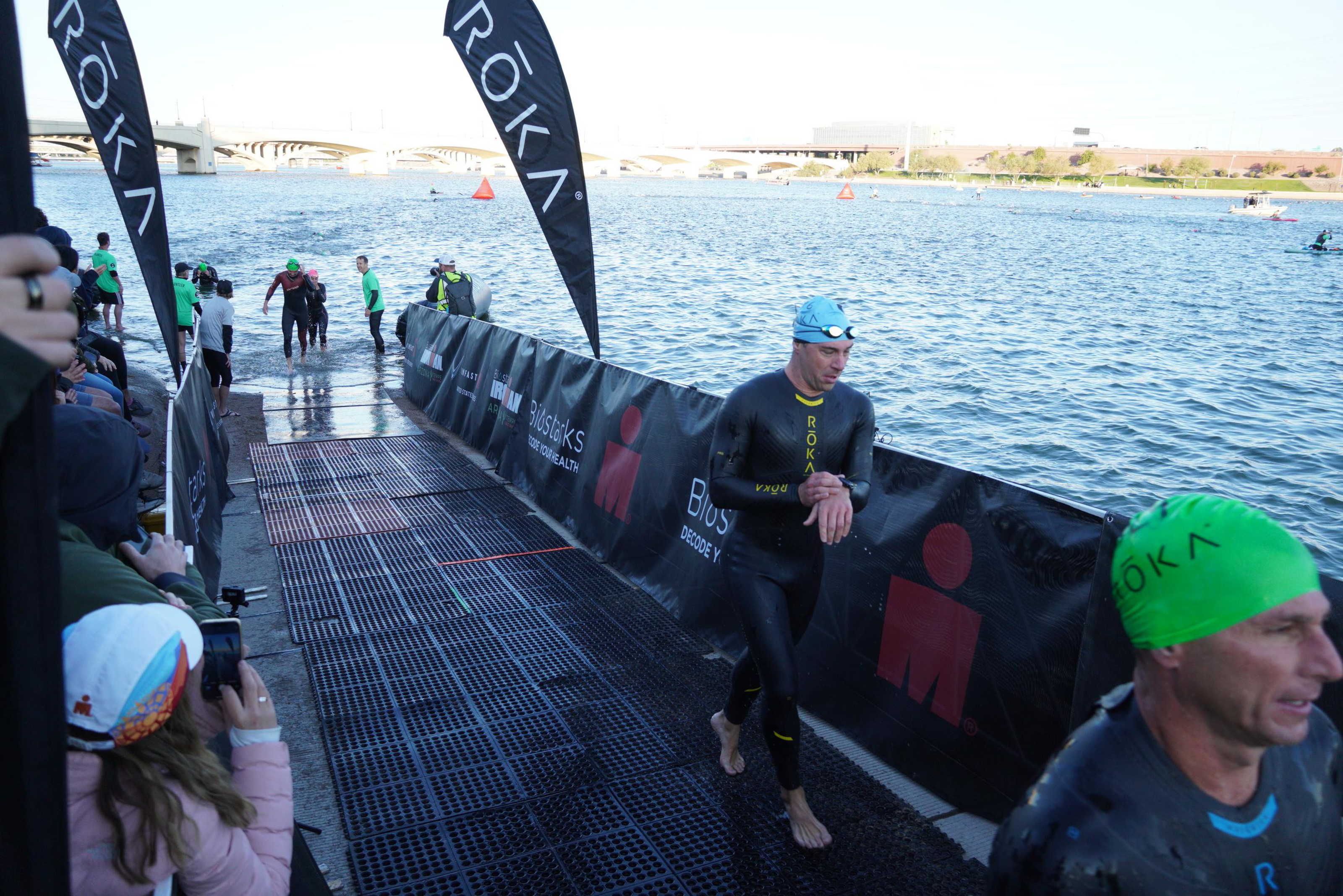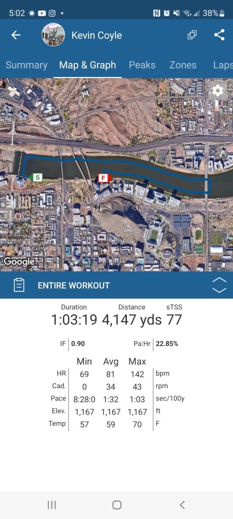 Over the last quarter my feet started to go a bit numb from the cold. Coming out of the water, I was near the edge of the dirt ramp within the water, I sort of fell over into the buoy, and a volunteer had to grab my arm so I could get up. It was a bit funny. I looked at my watch to a 1:03 just thinking, “What the hell happened there?”. I mean when you know that you are in strong shape, and you feel like you swam well but then you see a time totally off, it can be very frustrating. At 70.3 WC only 3 weeks earlier I swam 29:13. And then at IMAZ’17 and ’18 I swam 1:01:23 and 59:18. Even in my past 2 Konas in ’16 and ’19 with a swim skin in salt water I went 1:03:21 and 1:03:03. Although Tempe Town Lake is a river, there is not much current because there is rarely active water flowing in Phoenix. All I could say is that the headwind on the day took it’s toll along with the “heavy water” and maybe just swimming in 59F water (Garmin reading) made everything stiff and not very fluid. Compared with 70.3WC which was one of my best ever swims, my cadence of 34 was consistent but water was 63F, 4 degrees warmer. I wore 2 caps in both races. But peak 10min and 20min speed was 1:23/100yrd vs 1:25/100yrd and 1:25/100yrd vs 1:27/100yrd.