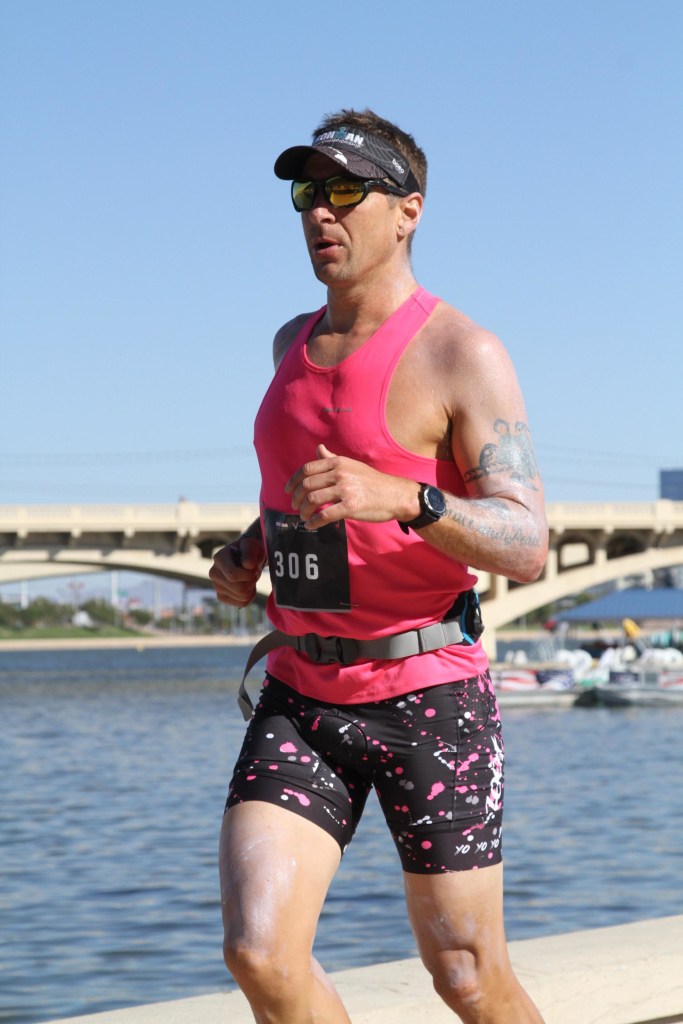 As I stopped at the dismount line, my back was locked in the aero-position and my legs felt absolutely terrible. I “ran” to my bag and then the change tents where I put on a pink BOA Singlet, camelpak waist belt carrying 1 LMNT Salt pack, a container with 4 salt sticks, and extra LMNT pack, and 2 more Imodium. I put on my visor, socks, and Altra Escalante’s. I left the tent and the volunteers put sunscreen all over me. I hit the start line and lapped my watch.
