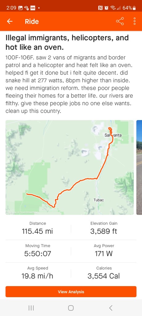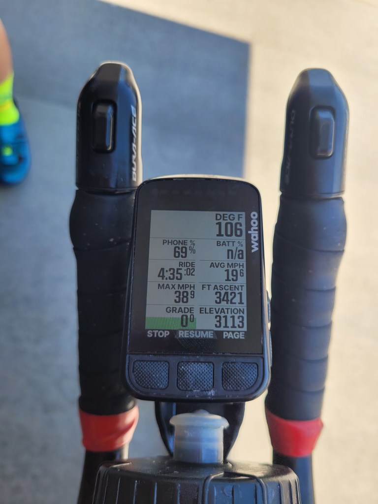 Saturday Fionas coach had 115mile ride planned so I stayed with Fiona to keep her safe. We started at u20am here in Sahuarita, AZ but by hour 4 temps were at 105F. We headed south to Arivaca and 286 where lors of the lical pros like Hoffman and Long ride all the time. The road is by far THE best road in Tucson. Just wow. We stopped at Arivaca twice, and a Dollar General. 5hr50min. We headed to Ventana Canyon Resort to celebrate our 9 year anniversary and I ran 5M on the treadmill. Then we went for a very memorable meal at Lowes Resort, just stunning. Champagne and wine had me sleep terrible and wake up at 4am to drink water… the plant food diet and no alcohol was mostly non existent this season but meat is still not a major purchase in our house.