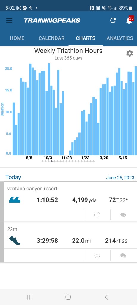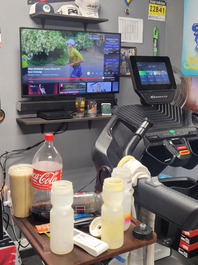 We woke up and swam 4,200 yards in an amazing lap pool with some strong swimmers. We headed back and I just completed a 3hr30min, 22mile run on the treadmill. It was 108F when we got home and this week its going up to 112/113 so will be mostly inside.