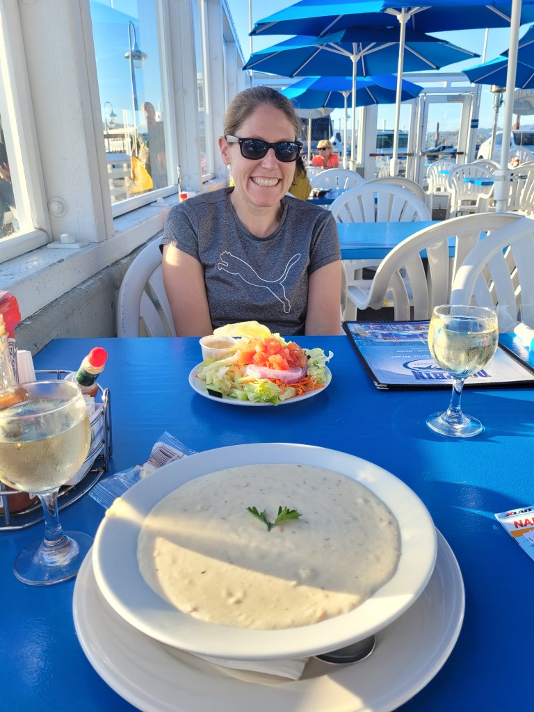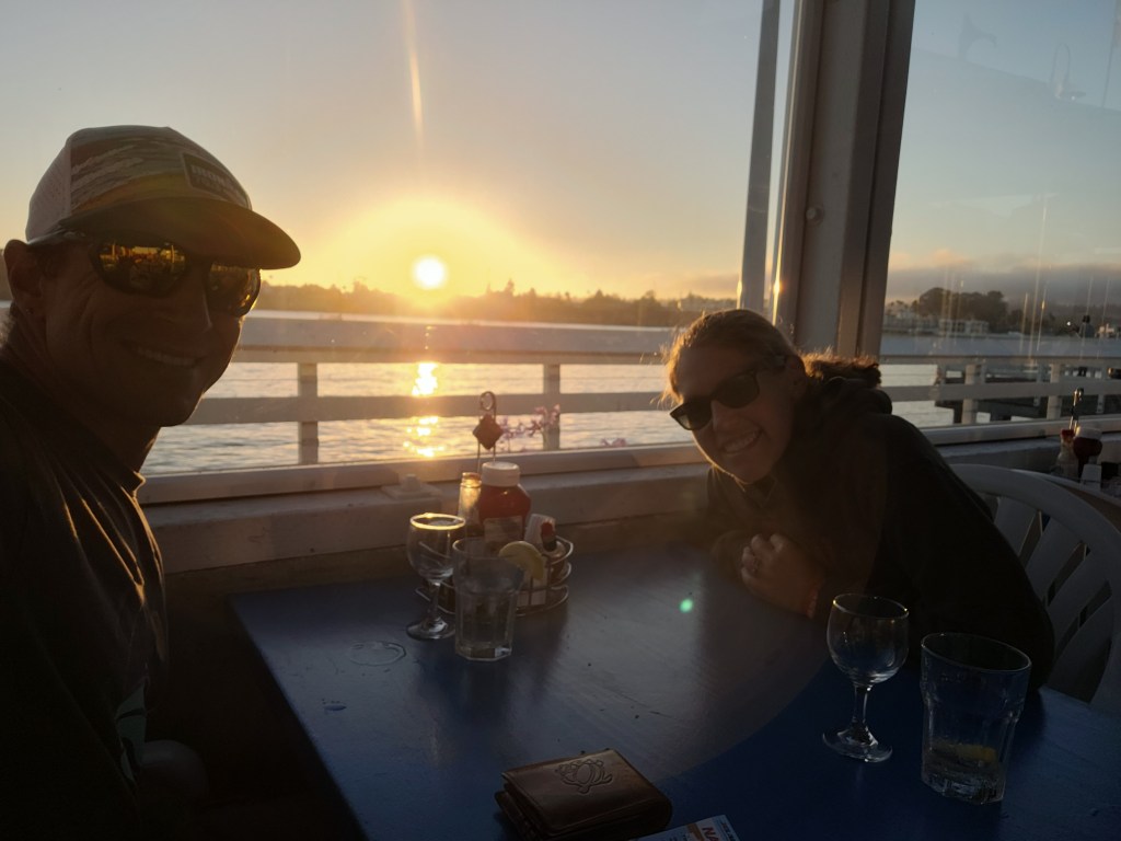 No pacing. Go as hard as you can. I took off and wasn’t anywhere near my PB pace but was OK with the pace and just felt like I was working hard and solid. I took gatorade from the aid stations. At mile 3 I had to pee, as I was most of the day and super hydrated. I walked to grab a gel and get the pee flowing… I dont stop. This was my only walk on the run. The volunteers were great and this course was mostly flat over varied surfaces. The loop around the reserve over looking the cutout bluffs was great and Fi saw seals on the beach. I kept getting passed as I am 15-20min slower on the run than the boys at top. I saw Fiona at mile 9, her mile 4 and she had a great big smile. I thought she was a bit far back but her finish in 5:28 and 14th A/G was solid. With 3 miles to go, I went down through this wooded area, a bee hit my face and stung me. It hurt worse than my legs! haha. I also saw our friend from Project Multisport Tucson, Kailey but missed Chas. Well done friends on your first Half! I picked up the pace and HR the last several miles as 13.1miles really doesnt sound far once you train for Ironman, so the positivity was there. I also wasn’t focused on the time, just my effort and giving my best. Down the last segment, on to the beach, another finish. I sat in a chair waiting for Chas and Fiona and went out to support Kaylie.