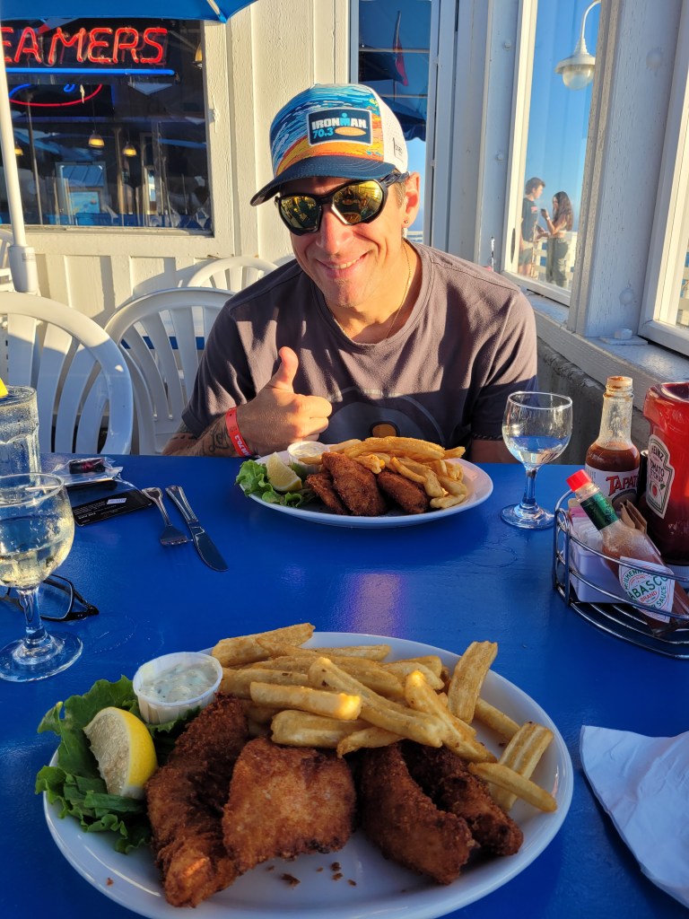 No pacing strategy. Go as hard as you can and be fast. I headed out on new roads and once I got to RT1, got down and started moving. I held 301watts for 20min, 294watts for 30min, and 282watts for 1hour. Goal was 300 watts for 1hr but didnt know what I had in me. I did Mt Lemmon 2 weeks ago and only held 261 watts for 1hr.. quite poor for me.. Positive was 3rd best 90min power in 2023 at 272 watts. I think residual fatigue from Lake Placid. I drank every 7min with my automated timer and threw in LMNT too. I had gels at 30min, 1hr, and 90min with the 2nd Caf 100 at 90min. I went around 1:11 on the way out and was battling with a pack of 5 but was dropped and went solo back into town. Power dropped and wasn’t able to sustain the power intensity. The road surface was pristine and the views were great. At mile 42, waves of people were on their way out, 28miles behind me. It made me feel strong to know how well I am able to perform and made me feel good. Wind wasn’t strong but it was present. The one steep decent had me peak at 49mph and Fiona hit 42mph! I finally got back to T2 in a time I was quite happy with considering there was 3,000′ of climb. But because this is on the coast, the only major climb was around 3min. Most of it was rolling which led to fast times.