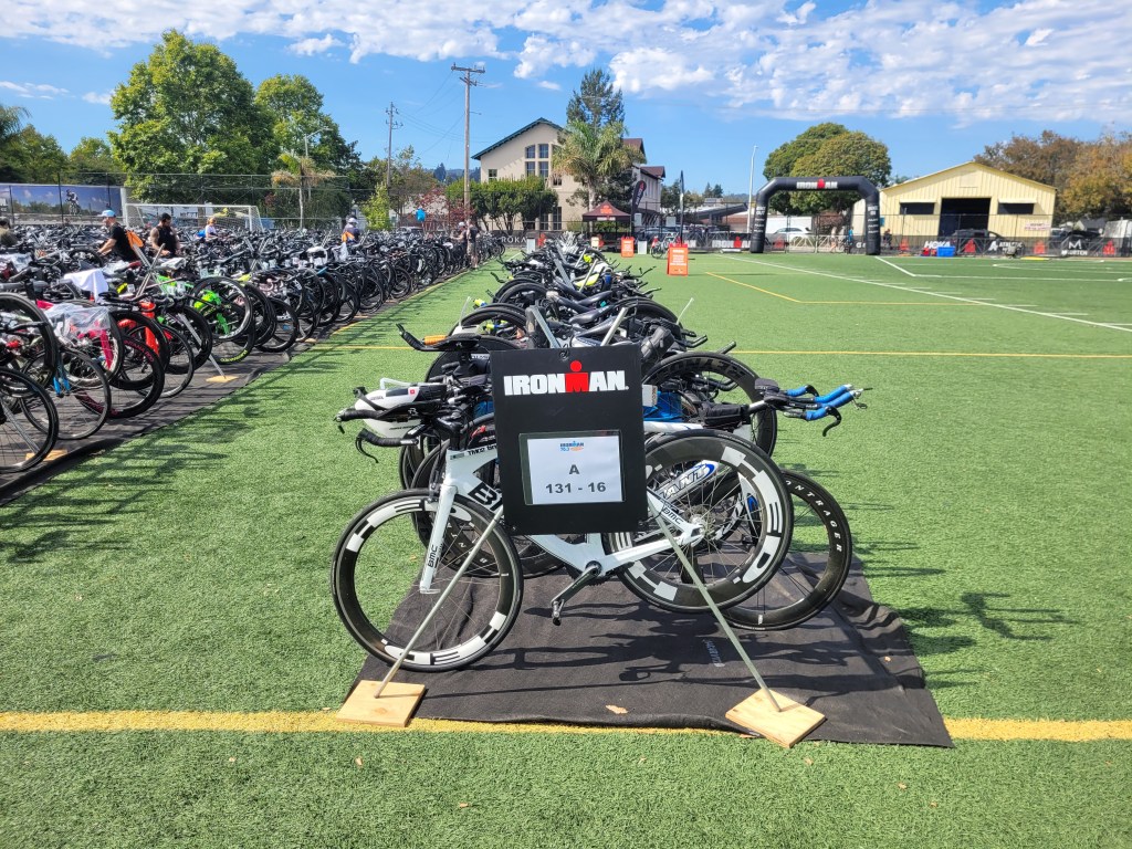 Saturday – 16min swim at 1:42/100m, not excited about the pace. Pursued by a seal. Water 63F cold but felt great after 2min. 3.5m bike and my new Vittoria Pro tubeless was leaking so spent $150 for a new tube at the expo which they put on for me and did a great job at TriPlay Sports. Thanks guys! We checked in the bikes to transition on a soccer field. My Gold All World Status had me with a nice low number 123 which I reckon I have had in the past. Perfect shot to the exit.