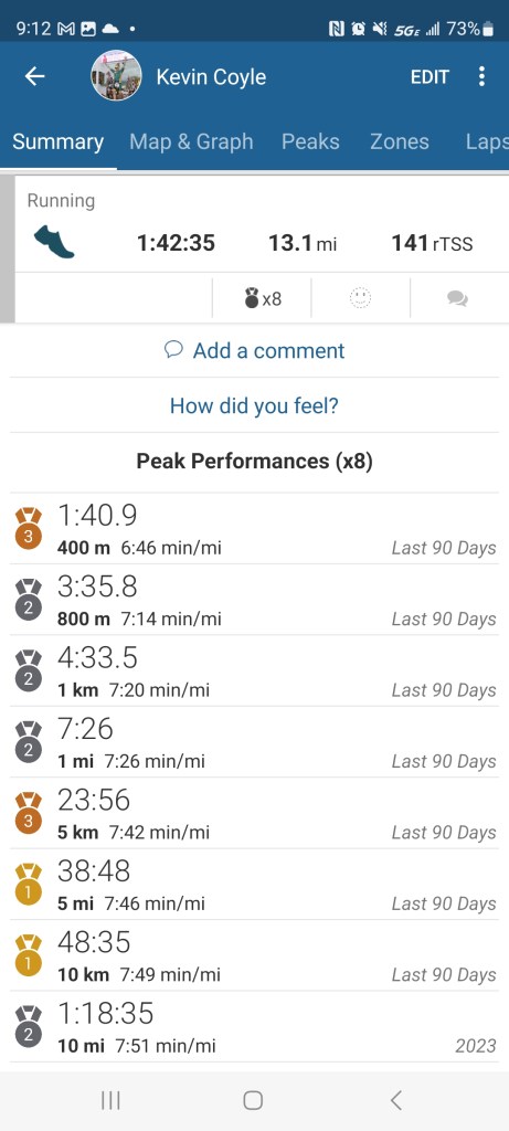Run 13.1miles – 1:42:32 – 7:40/mile – 50th A/G.