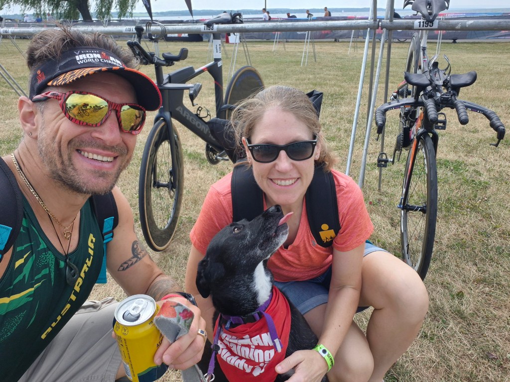 Up at 3:30AM. 2 pieces of white bread with Jam, banana, and 2 medium redbulls for 220g caffeine and 600+ calories after the previous days carbo-loading adventures. We left at 4AM and drove the 45min to Geneva, then walked the 1M+ to Transition. Front wheel with sealant to 80PSI, back rear disc tube to 100PSI. Bike held 3 bottles of Maurten 320 +200mg Caffiene, LMNT, and Mortal for 3G+ Salt and 960 calories. I had 1 gel. On the bike I went through 2.5 bottles and half bottle of water. I laid out my stuff underneath my bike and Fiona was 2 numbers down since they place you upon rego at the tent. Race turned into Wetsuit Optional. Even though Fiona and I didn’t go for 70.3 WC Spots, I opted for SwimSkin that I first got back in Kona 2016, 9 years ago! Same with Fiona!! 😊