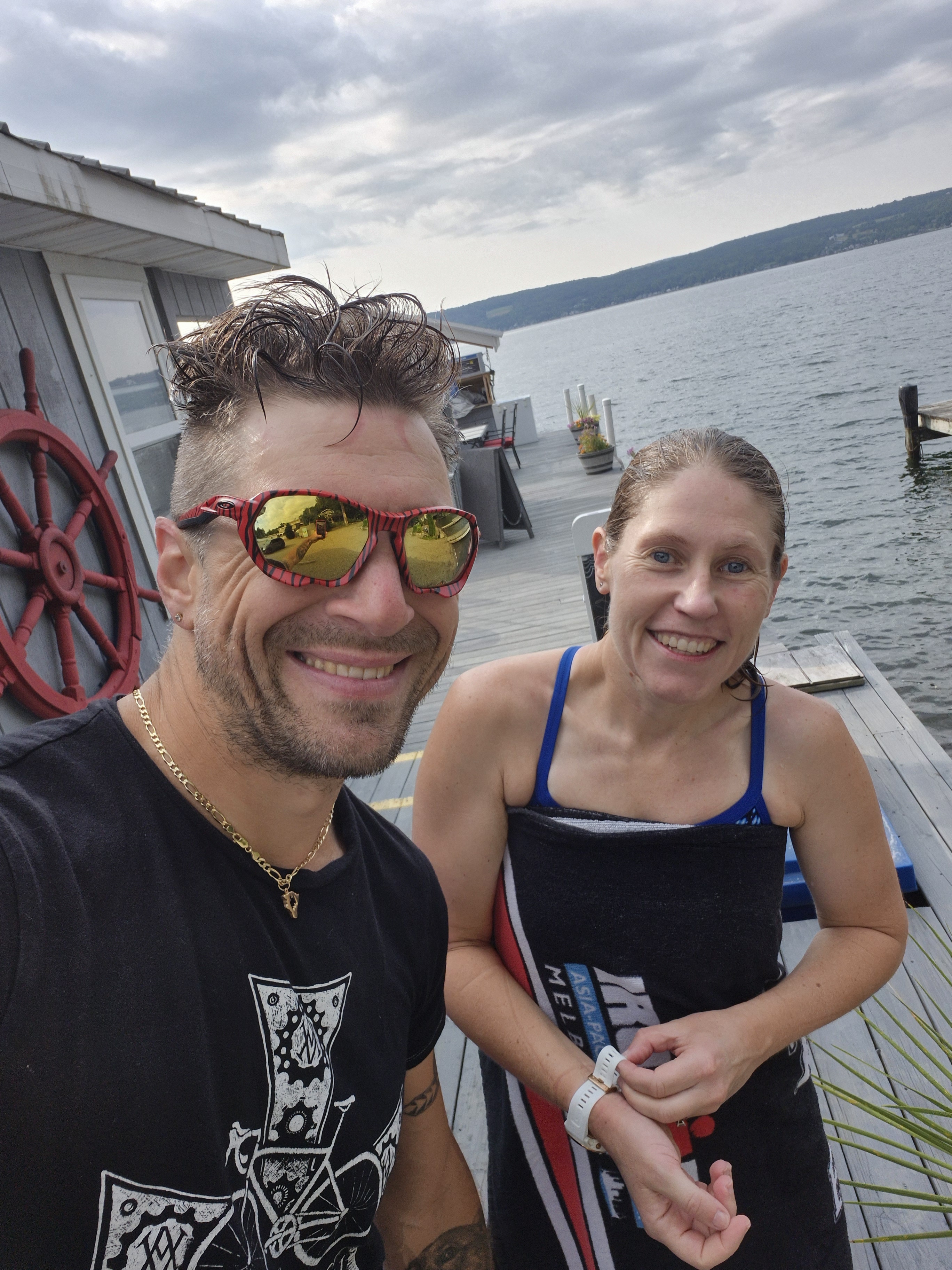 Up at 3:30AM. 2 pieces of white bread with Jam, banana, and 2 medium redbulls for 220g caffeine and 600+ calories after the previous days carbo-loading adventures. We left at 4AM and drove the 45min to Geneva, then walked the 1M+ to Transition. Front wheel with sealant to 80PSI, back rear disc tube to 100PSI. Bike held 3 bottles of Maurten 320 +200mg Caffiene, LMNT, and Mortal for 3G+ Salt and 960 calories. I had 1 gel. On the bike I went through 2.5 bottles and half bottle of water. I laid out my stuff underneath my bike and Fiona was 2 numbers down since they place you upon rego at the tent. Race turned into Wetsuit Optional. Even though Fiona and I didn’t go for 70.3 WC Spots, I opted for SwimSkin that I first got back in Kona 2016, 9 years ago! Same with Fiona!! 😊